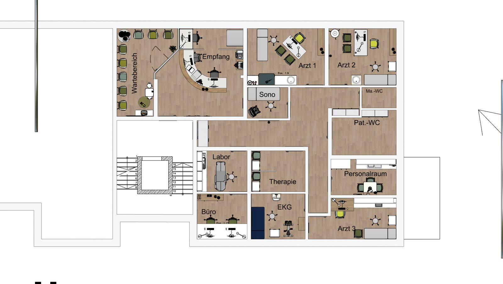 In die ursprünglichen als Wohnung gedachten Räumlichkeiten sollte eine Praxis für zwei Ärzte geplant werden. Die Herausforderung war hierbei die ideale Ausnutzung der sehr begrenzten Fläche. Durch die enge Zusammenarbeit mit den Ärzten wurde so ein Funktionsplan entwickelt, der am Ende allen Wünschen gerecht wurde. Erstellung mehrerer Grundrisse sowie ergänzende 3D- Ansichten haben diesen Prozess erheblich erleichtert und zum gewünschten Ergebnis geführt.